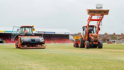 Following the 2018-2019 football season we renovated and adjusted the levels on one of the goal mouths at Grimsby Town FC. The existing surface was stripped with an excavator. Laser guided equipment was fitted and our skilful shaper relevelled the existing soil. We then spread sports sand and aerated the goal mouth. Finally, we hand raked the area and seeded. During the project we also disc seeded the main pitch.